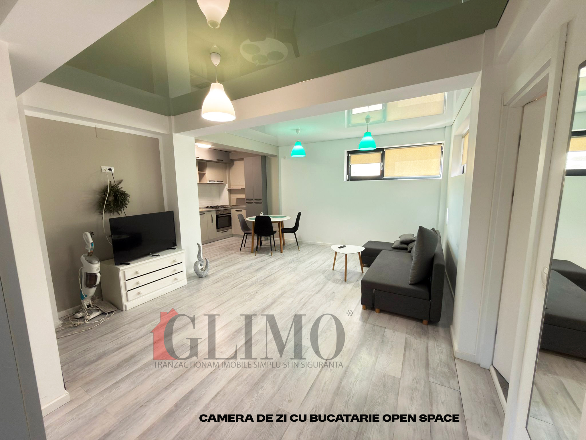 Living cu bucatarie open space, dar se poate delimita bucataria de living cu usi din sticla.